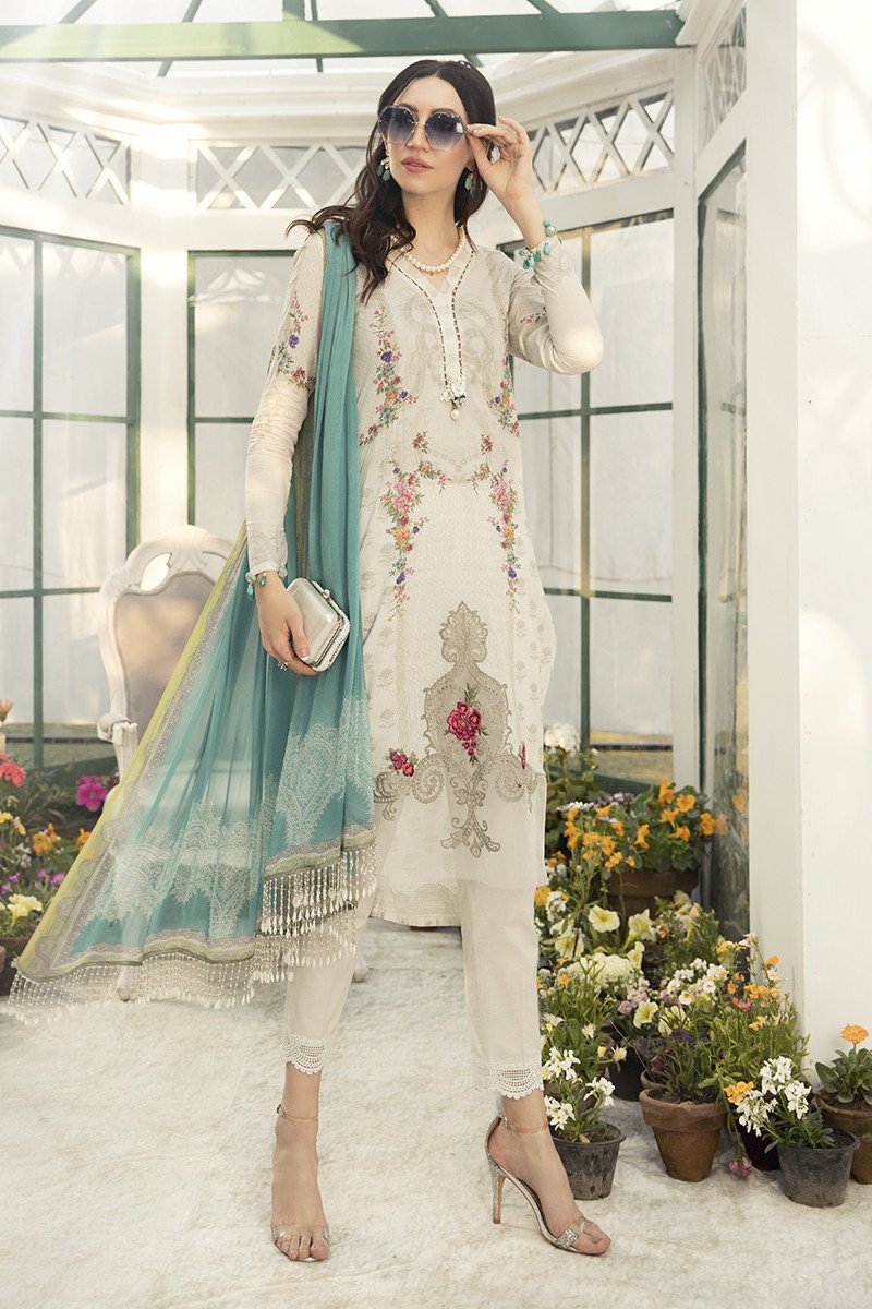 Maria B Winter White Color Printed Dress with Printed Shirt, Trouser, and chiffon dupatta. They are beautiful matching. The Price In PKR 5,894.57. Dress Code: MPT-812-A