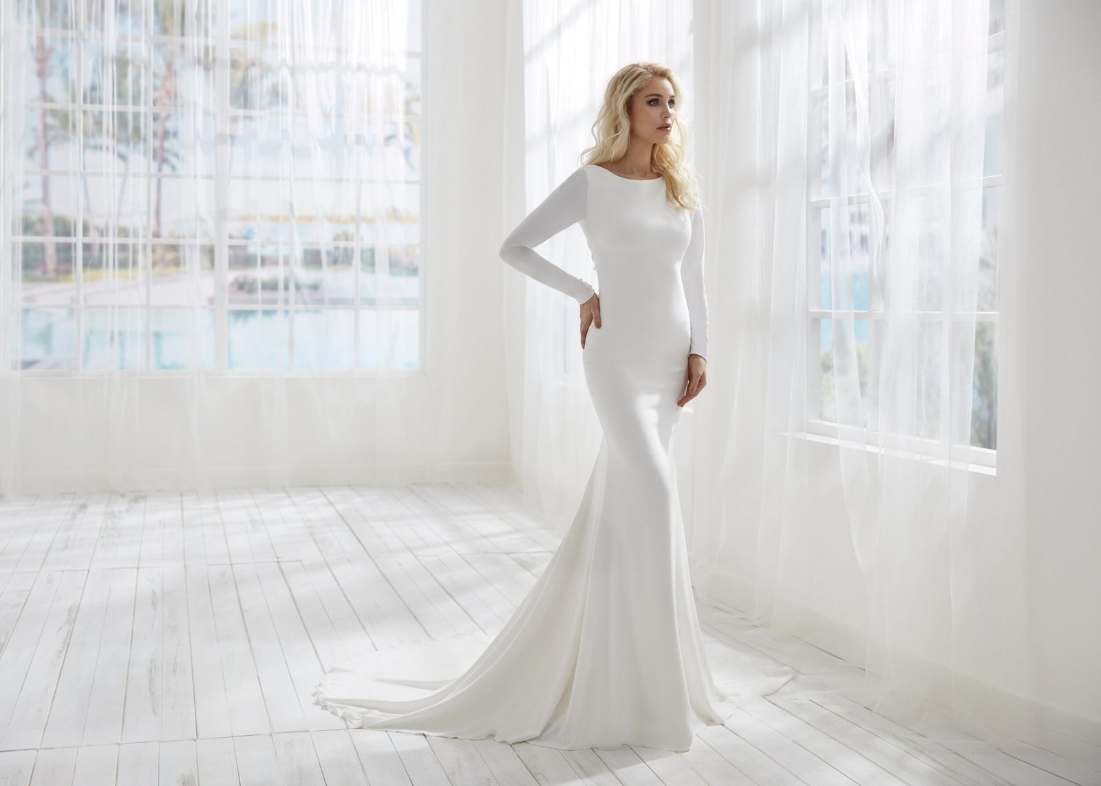 Long Sleeve Fitted and flare Simple Bridal Dress with Open Back, They Hava a new style Lunched. Designer: Randy Fenoli, Style: #BLANCA. The Price In USD $2,050.00.