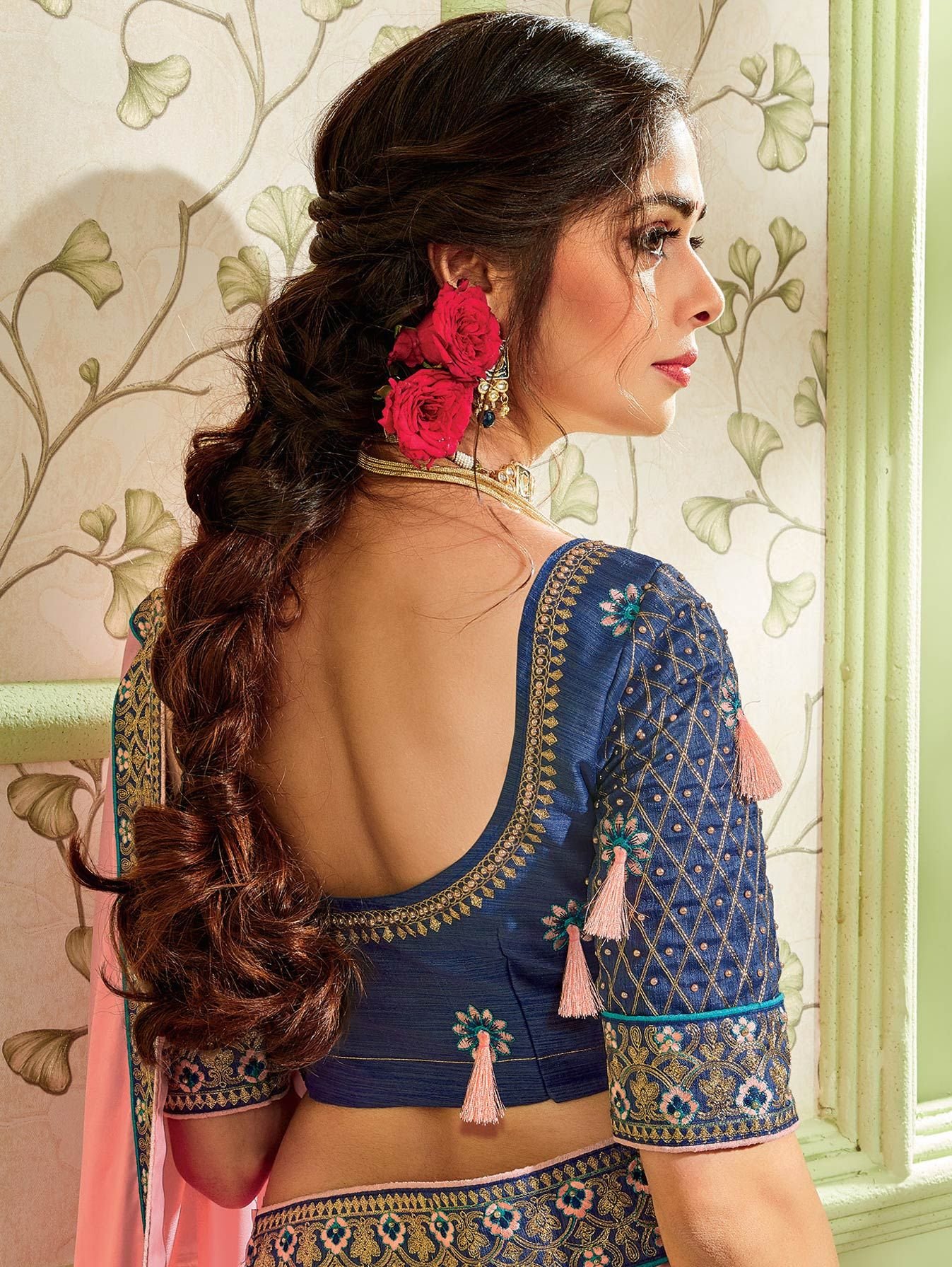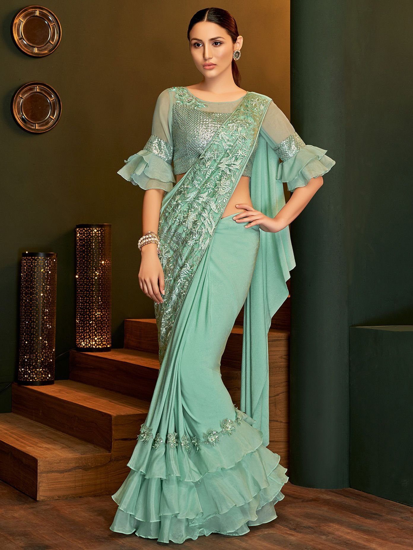 Indian Partywear Fancy Saree, Blue Colored Pre-Stitched saree in Lycra Designed with Zardosi Embroidery Butta at the pallu enhanced by a golden border. Also, Come drop Shoulder art Silk and net Blouse in matching Color. The Price In INR ₹6,823.00. Dress Code: 2393SR07