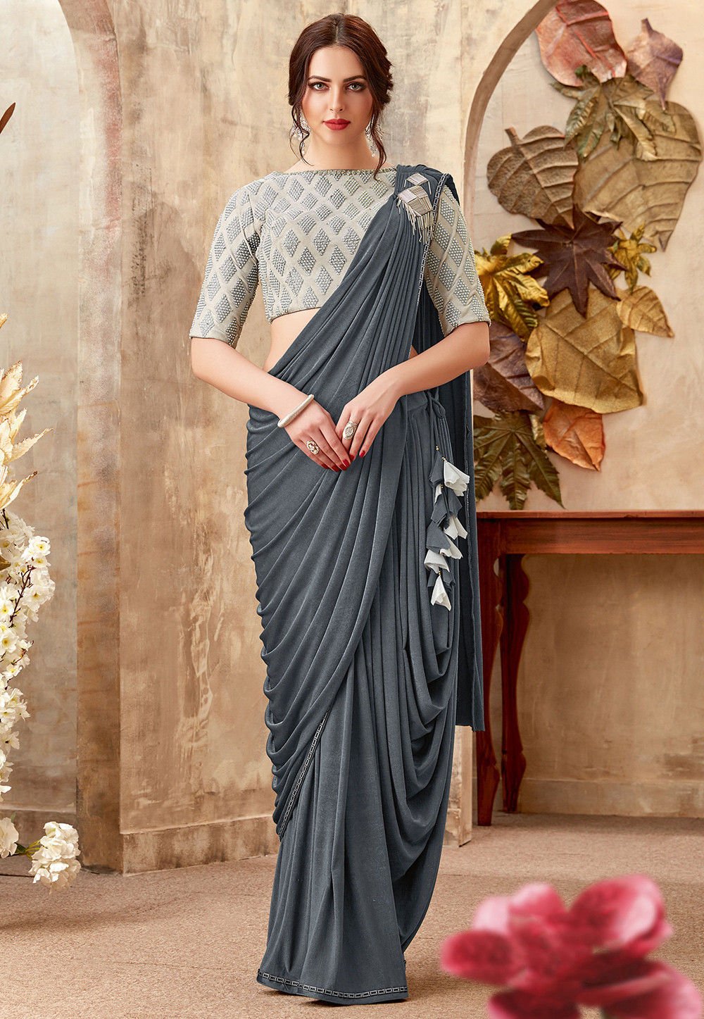 Indian Party Wear Grey Lycra Pre Stitched Fancy saree with Sequin Work with Stitched Raw-silk Blouse and Fancy Look. The Price In INR ₹5,735.00. Dress Code: SABE3362