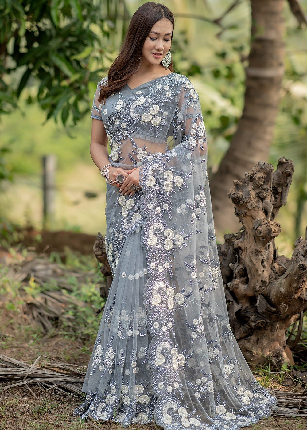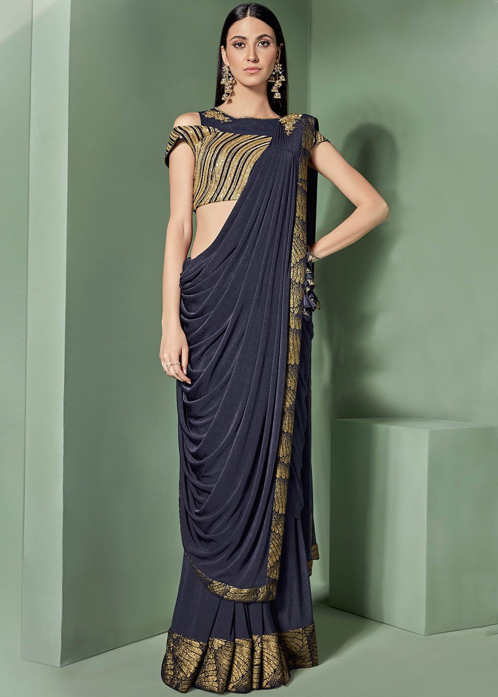 Indian Party Wear Sarees, Pre=sititched lycra Cowl Style Saree In Dark Grey with a SemSititched Resham and Beads Embroidered Art Silk Blouse In Off-white Saree. The Price In INR ₹9,140.38. Dress Code: SWS5026