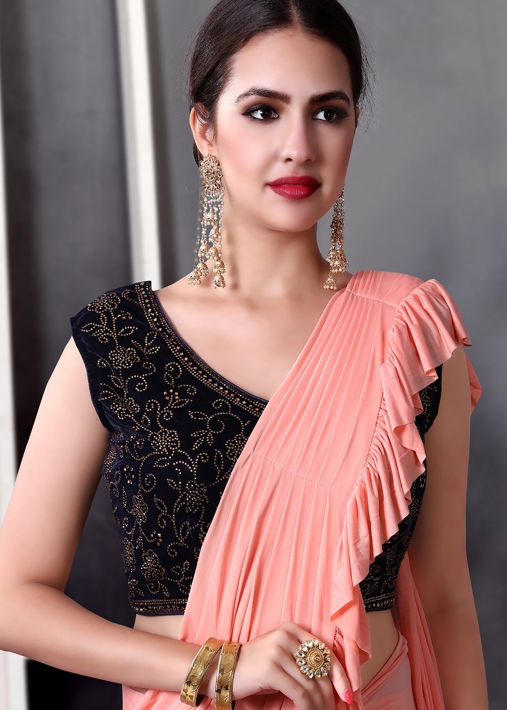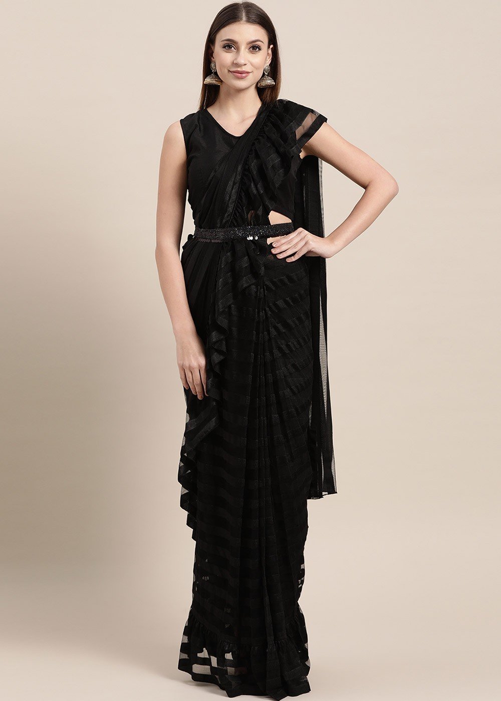 Indian Partywear Fancy Saree, Look, stunning Adorning this Black color pre-stitched Art Silk saree design that has been Beautified with ruffles detailing all along its border Enhanced sequined belt at front. Also, Come in art silk Black Blouse. The Price In INR ₹4,246.85. Dress Code: 2592SR05