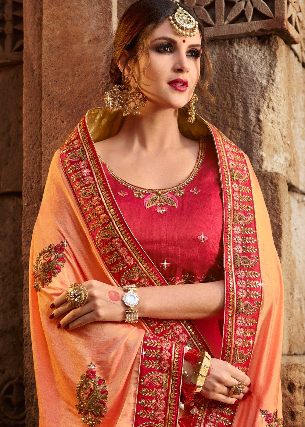 Indian Partywear Fancy Art silk Peach Saree Design, This is a new Indian style. Peach art silk saree embellished with all-over motifs and lace border in zari, Resham embroidery, and beaded details. Also, come with a red silk blouse in similar work. The Price In INR ₹10,674.53. Dress Code: 1828SR06