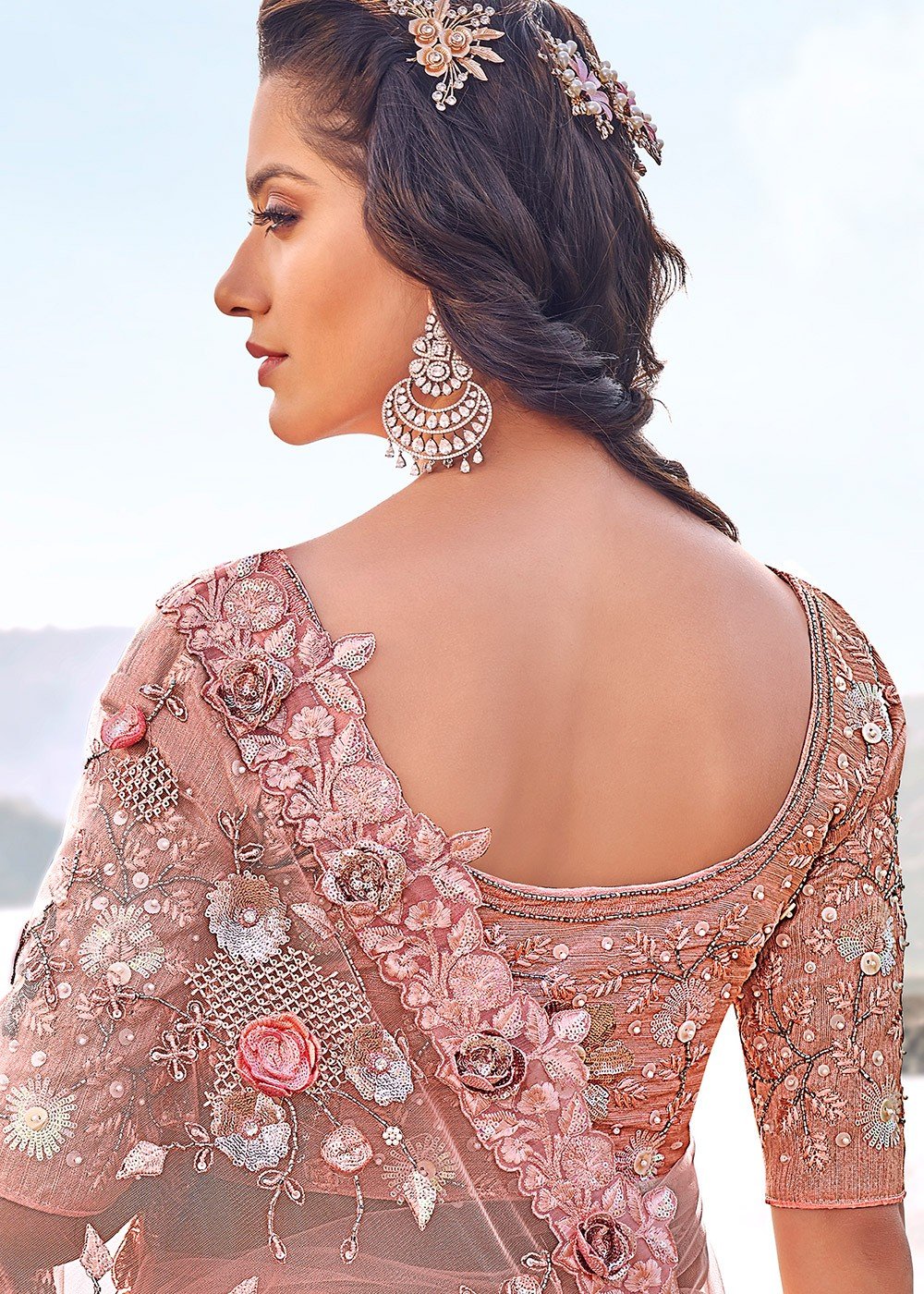 Indian Peach Color Embroidered Net saree with Blouse. They are the New Style Of Party Design, The peach color net designed with Resham embroidery and flower appliques detailing enhanced by cut beads. The Price In INR ₹15,736.69.Dress Code: 2588SR01