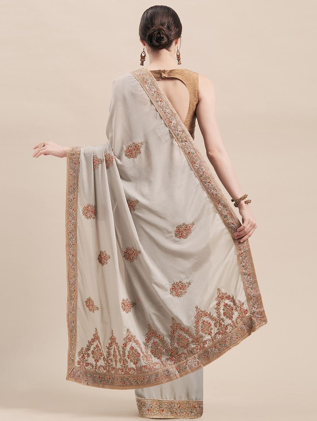 Indian Party Wear sarees, Embroidered Border art Silk Saree in Light Beige with a Semi-Stitched Embroidered Art Silk Blouse in Light Beige. The Price In INR ₹9,378.00. Dress Code: SSHA1463