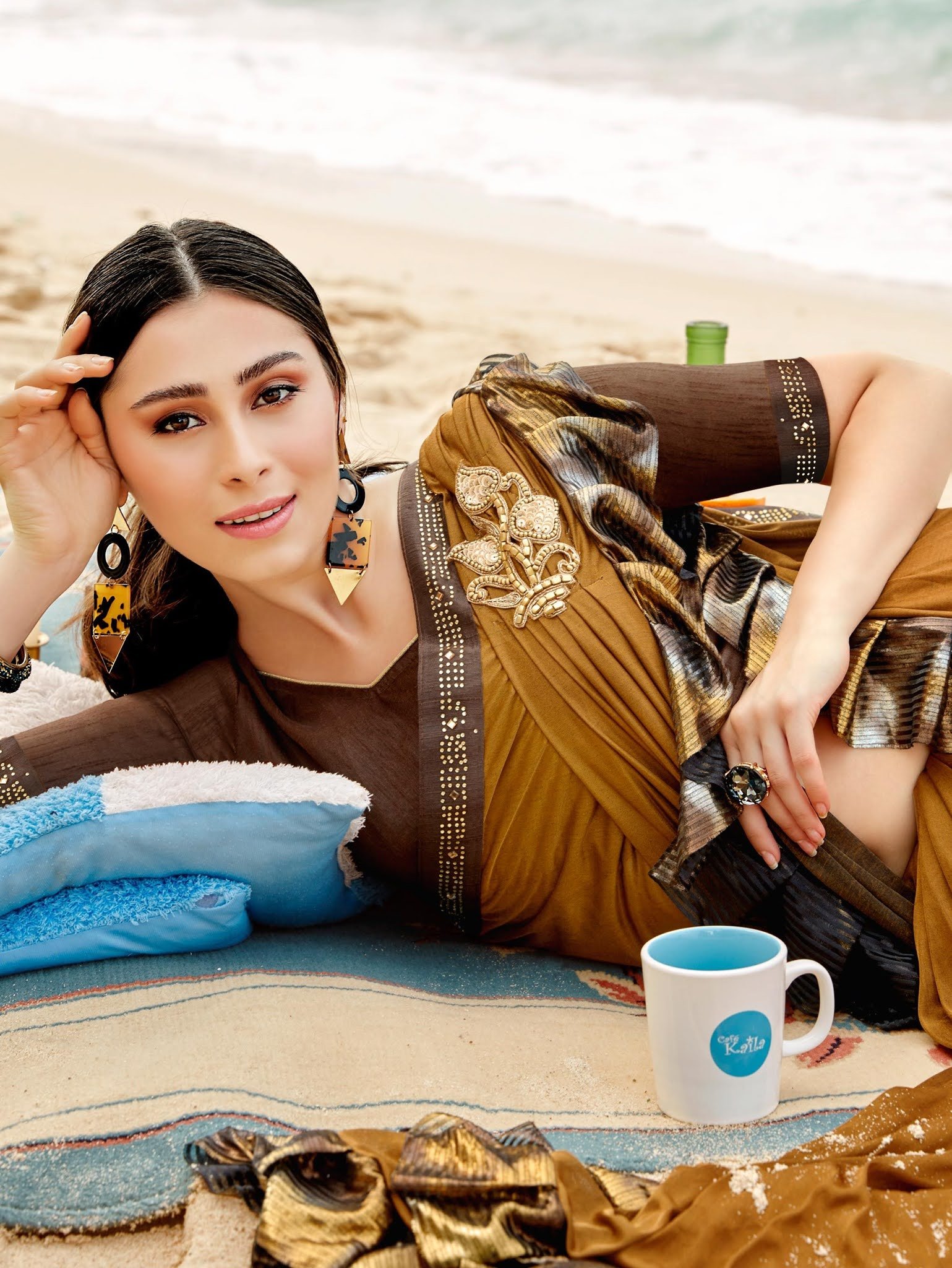 Indian Party Wear Saree, Brown, and Golden Lycra Pre Stitched Fancy Lehenga Saree With Stitched Silk Blouse And Fancy Look. The Price In INR 6,420.00. Dress Code: SABE3367