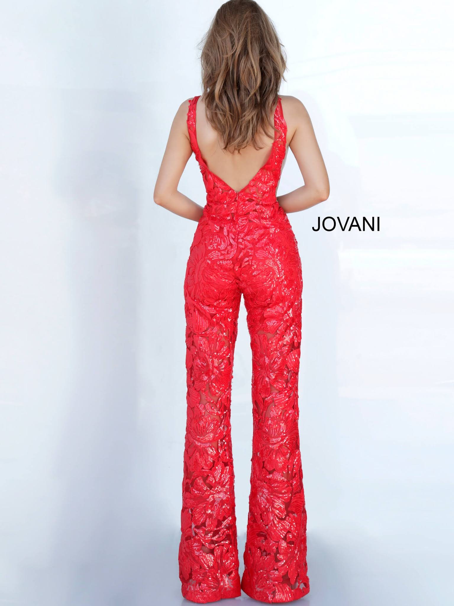 Jovani Red Color Sexy V-Neck Embellished Red Carpet Jumpsuit Dress: