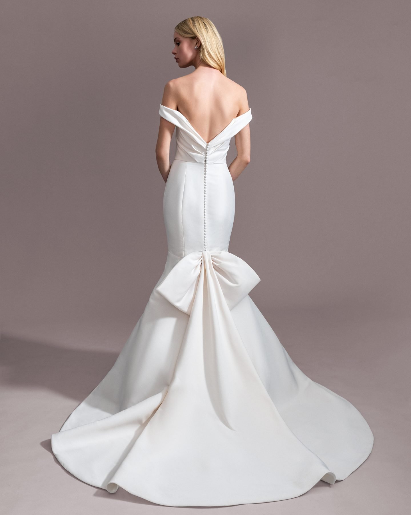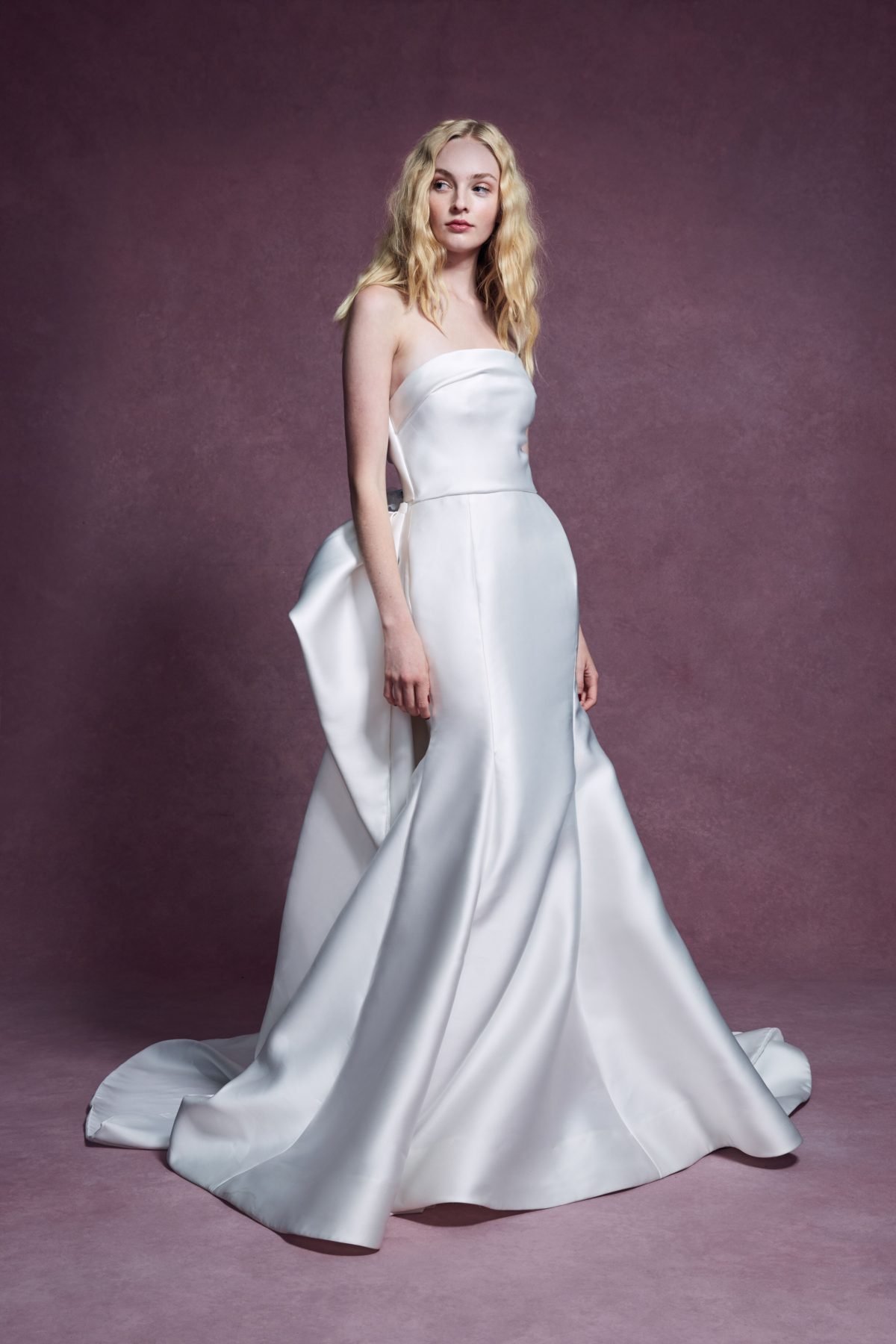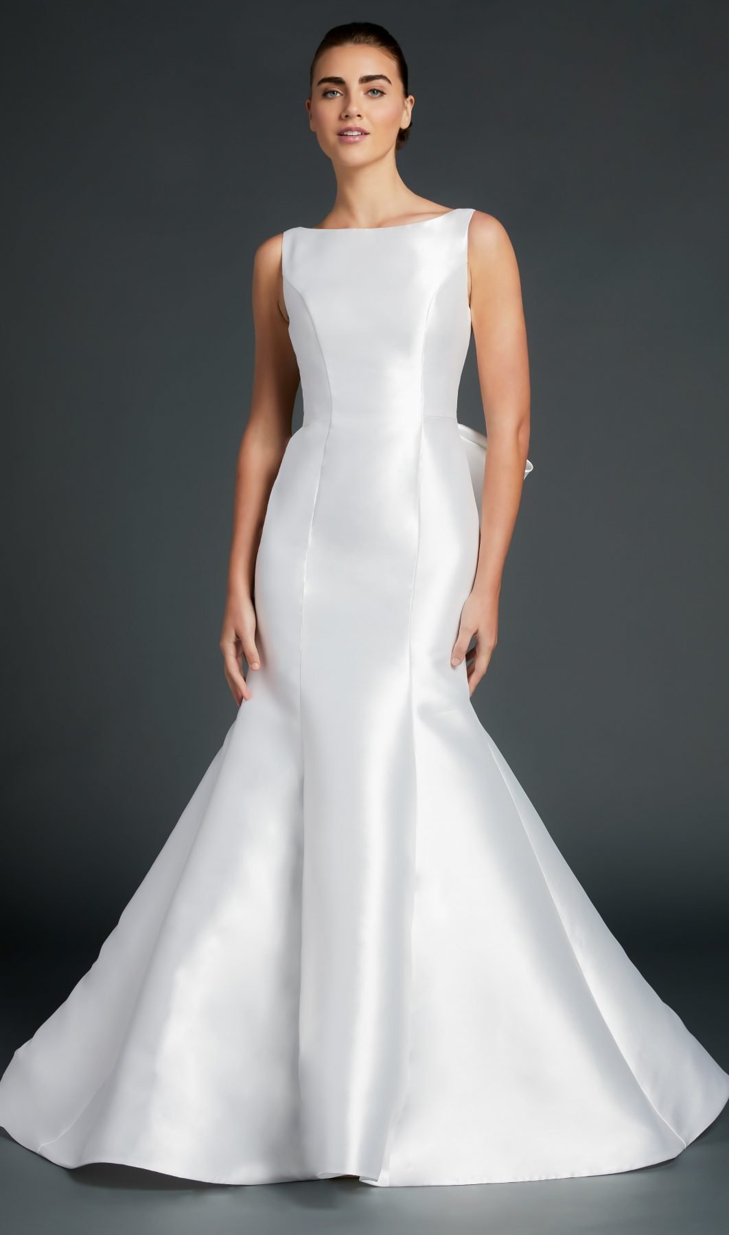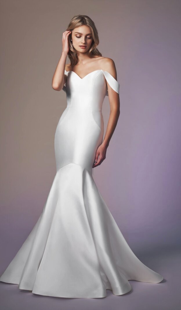Pointed Sweetheart trumpet gown of mikado flattering the figure with curved seaming at hips. Designer: Anne Barge, Style: #TODDY. The Price In USD $1,970.00.