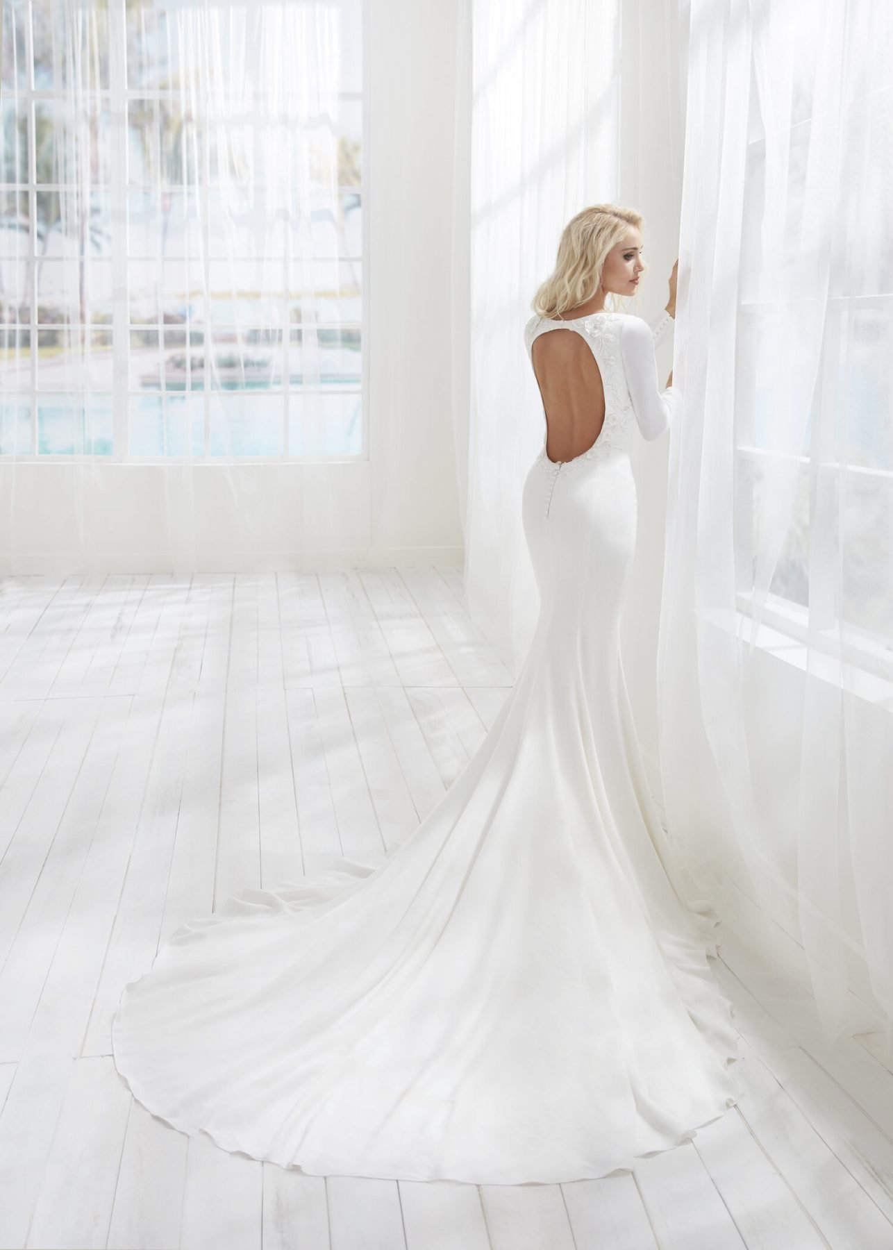 Long Sleeve Fitted and flare Simple Bridal Dress with Open Back, They Hava a new style Lunched. Designer: Randy Fenoli, Style: #BLANCA. The Price In USD $2,050.00.